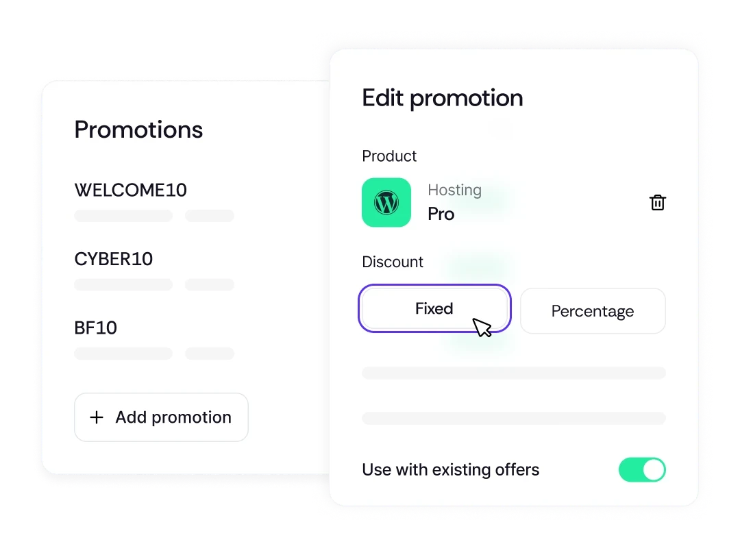 Boost sales with discount codes, promotions, and custom pricing. The built-in affiliate system helps you reward referrals with one-time or recurring commissions—turning loyal customers into brand advocates.