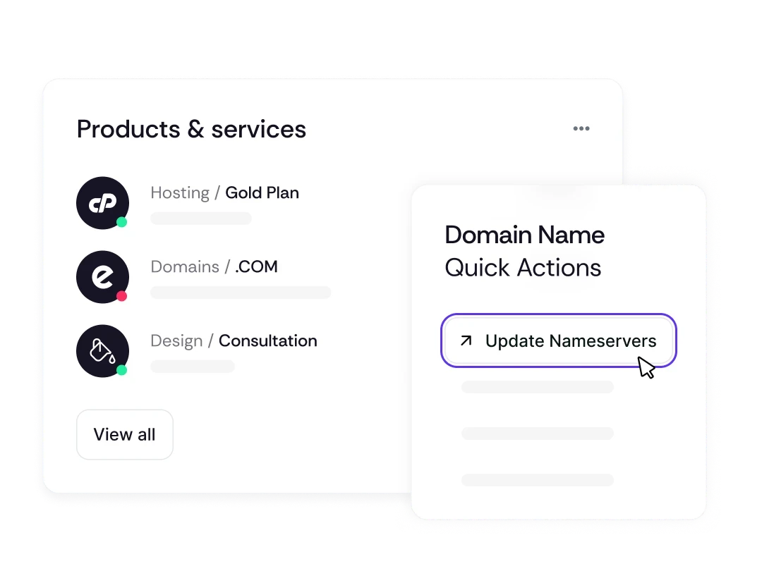 Customers can manage hosting services, domains, invoices, and support tickets from a custom-branded client portal. They can log into their control panel, update domain nameservers, and renew domains without needing support.